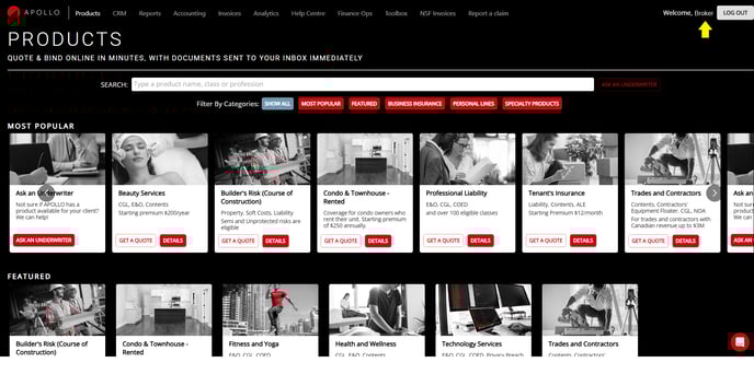 Once logged in, you should automatically be taken to the "PRODUCTS" page. Ensure that you can see your name at the top right corner next to "LOG OUT". This means that any applications you quote or bind will be under your broker login and won't be accessible to anyone else in your brokerage.