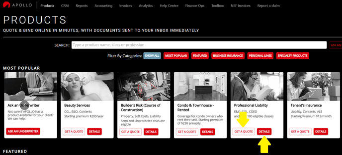 There's 1 of 2 ways you can "obtain a quote". Either click on "GET A QUOTE" on one of the product tiles or "DETAILS". The "GET A QUOTE" option takes you to the application right away.
