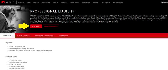The "DETAILS" option takes you to explore the specific product. You can browse the overview, eligible classes, coverage & wordings, and resources sections from here. When you're ready, the "GET A QUOTE" option is available on this page as well.