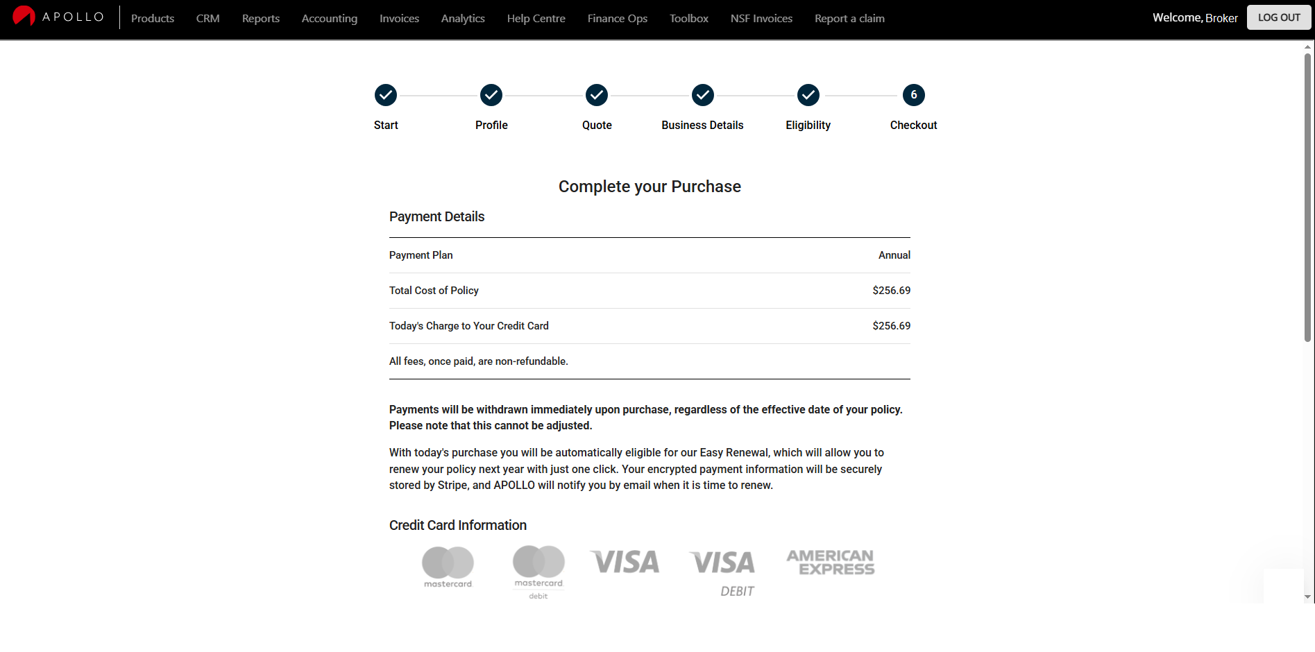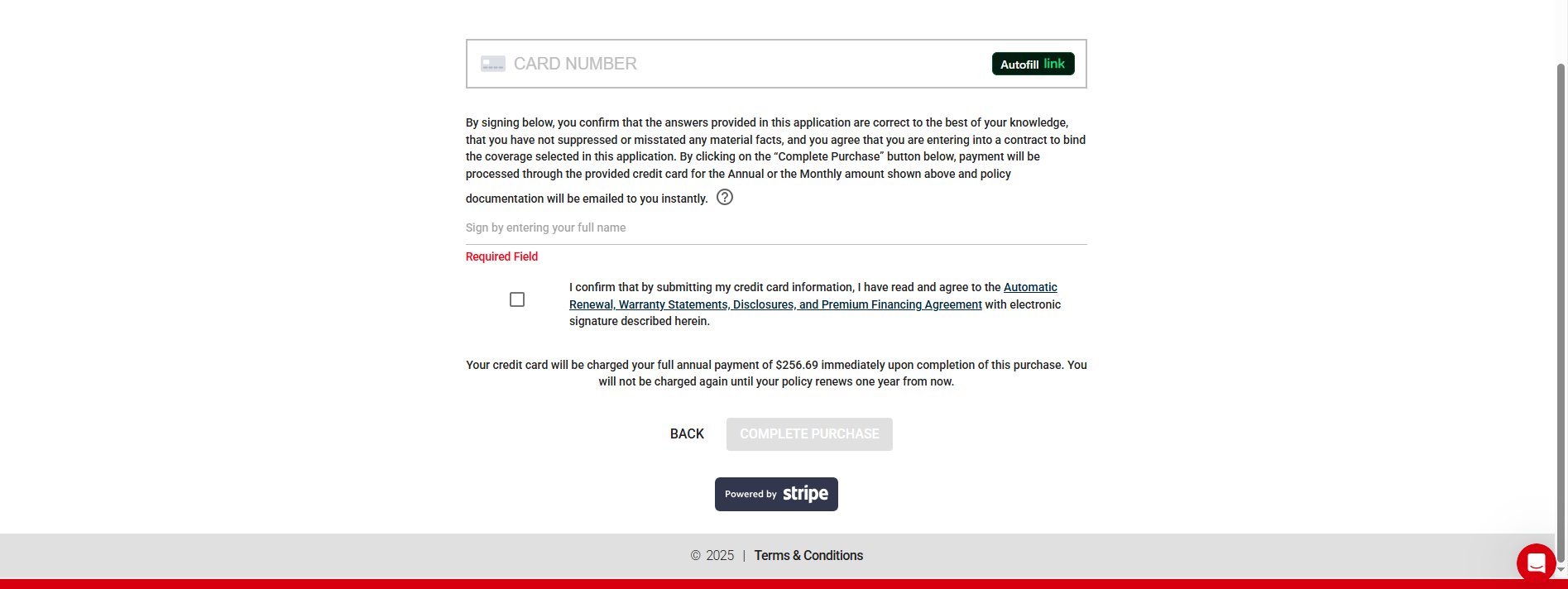 Once you've gone through each page of the online application, you'll reach the "Checkout" page. From here, you can enter the card number you'd like to use to pay for the policy. We accept MasterCard, MasterCard Debit, Visa, Visa Debit, and American Express.