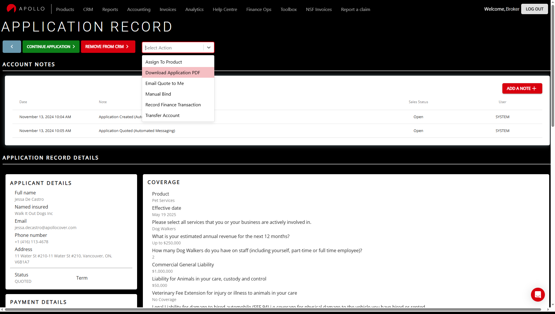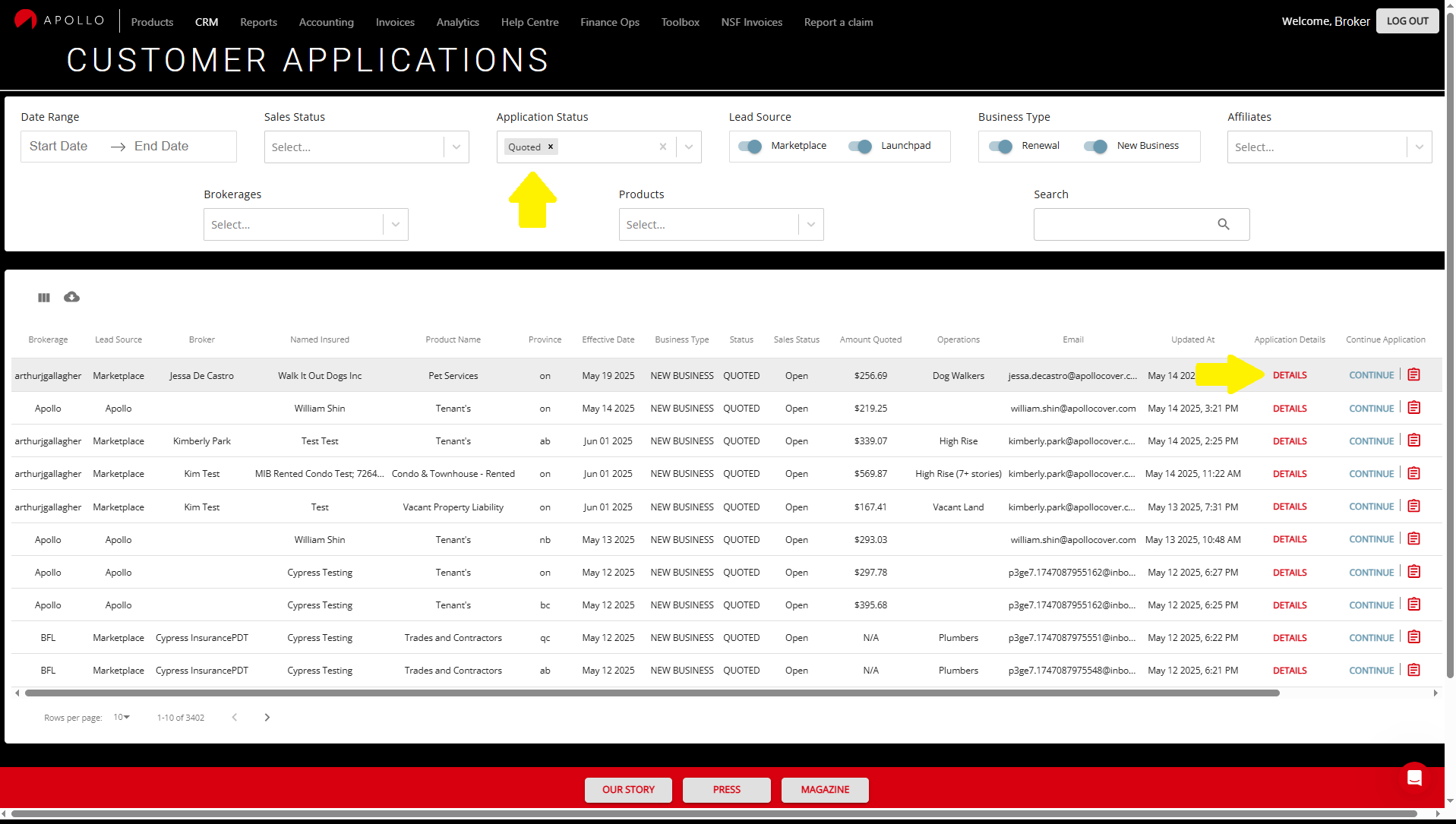 From your CRM, you can find the quote. Remember to select "Quoted" in the "Application Status" to view quotes only. Scroll to the right under the "Application Details" column. Select "DETAILS". This takes you to the APPLICATION RECORD.