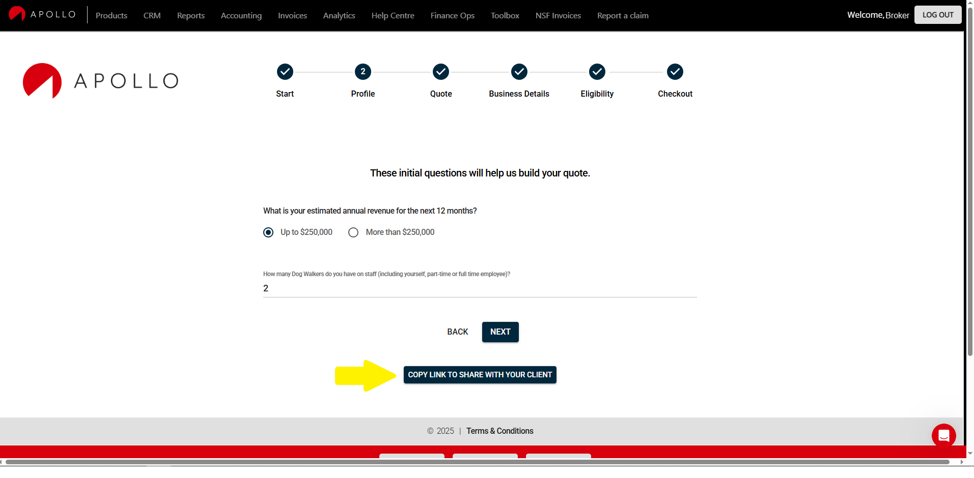 At any time during the quoting process, you can share the current quote with your client via a link. On any page of the quote, scroll down to the bottom and you'll see a button called "COPY LINK TO SHARE WITH YOUR CLIENT". This automatically copies the URL to the online quote. CTRL + V to paste onto an email for example. Or you can right click then select "Paste" on any other method of sharing the link with your client.