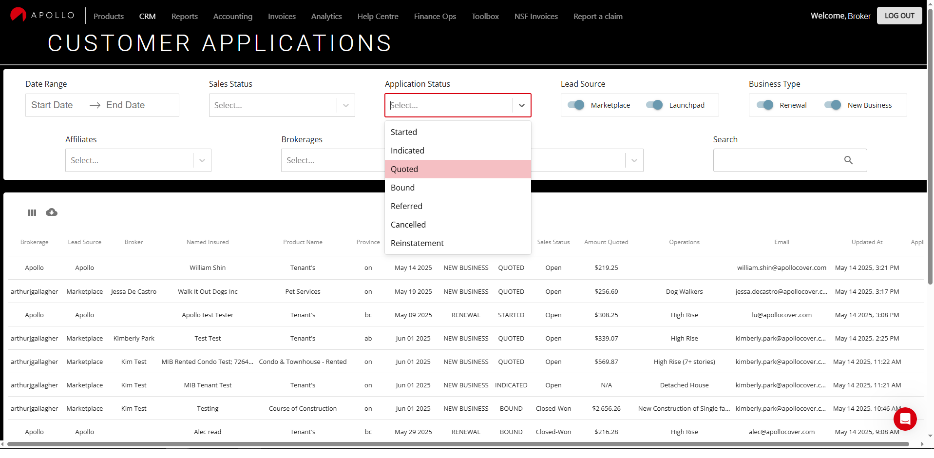 Select the appropriate "Application Status" to view your quotes. From the drop down, select "Quoted".