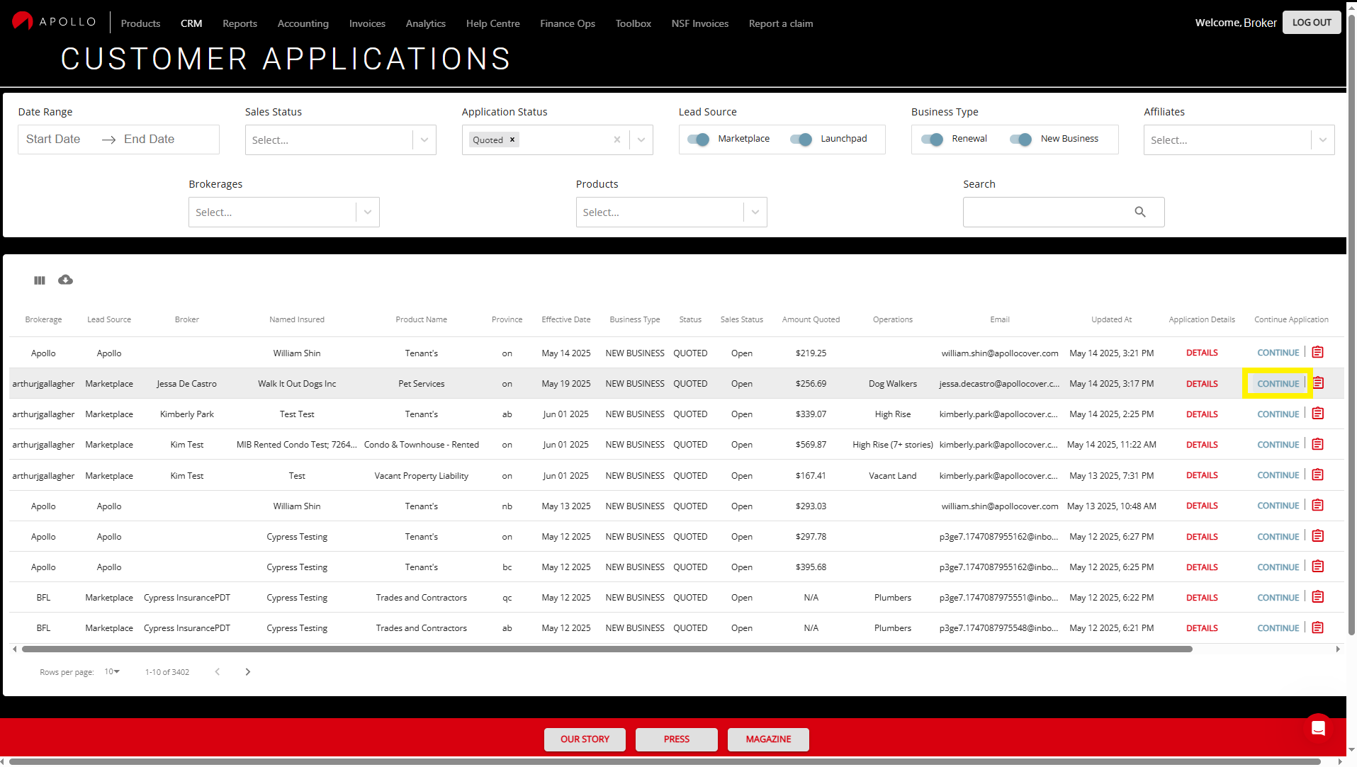 Find the quote you want to make changes to. Scroll to the right, under the "Continue Application" column and click on "CONTINUE". This takes you to the quote.